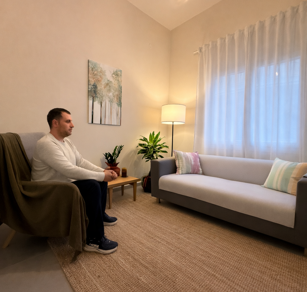 Έναν χώρο που επιτρέπει στον άνθρωπο να σταματήσει για λίγο, να αναπνεύσει και να στραφεί με φροντίδα προς τον εαυτό του. Είναι ένας τόπος όπου μπορεί κανείς να νιώσει ότι έχει χρόνο, ηρεμία και στήριξη, ώστε να μιλήσει ανοιχτά — χωρίς φόβο ή πίεση.